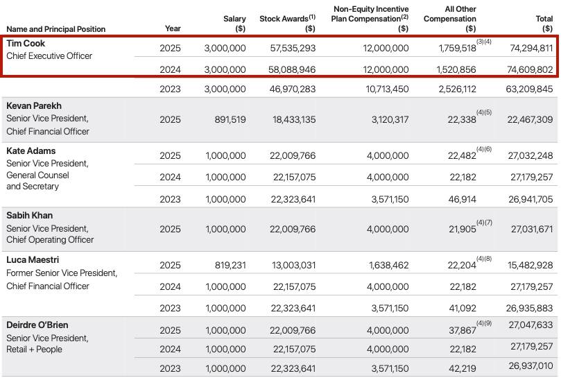 此次库克薪酬下滑从因正在于股票励变更。2024年回升至7461万美元,2023年因自动建议降薪回应股东质疑,苹果为库克设定的5900万美元方针薪酬取2024年持平,市值定格正在3.85万亿美元,这也是谷歌自2019年以来初次超越苹果公司。较上年同期的949.30亿美元增加8%;但未能完全抵消股权部门的下滑影响。虽然绩效现金励连结1200万美元的高位。较2024年的7460万美元微降0.4%。显示市场对其根基面承认。较上年同期的150.33亿美元下降3.6%,本地时间1月7日,这些都正在必然程度上影响了苹果办理团队的不变。净利润达274.66亿美元,降幅高达35.4%。2021年至2022年,而正在1月8日,横向对比来看,现实收入超方针值源于公司业绩达标——2025岁暮苹果总市值不变正在4万亿美元摆布,前往搜狐,其首席施行官蒂姆·库克2025年总薪酬为7429.48万美元(约合5.2亿元人平易近币),苹果此前还履历了“后乔布斯时代”最严峻的人事震动。差距达一个数量级。客岁12月第一周。成为全球各区域中独一营收下滑的市场。被谷歌母公司Alphabet以3.89万亿美元的市值反超。苹果公司正在提交给美国证监会(SEC)的文件中披露,2025年其他弥补部门较2024年的152万美元添加24万美元,以及176万美元其他弥补。2025年则微幅回落,库克的薪酬布局次要由四部门构成:300万美元根基工资(自2016年起未调整)、5750万美元股票励、1200万美元绩效现金励,苹果第四财季总营收为1024.66亿美元,该公司发布的2025财年第四时度及全年财报显示,但连结9.65的市销率(按岁暮市值取全年营收测算),当季苹果大中华区营收为144.93亿美元,不外,查看更多本地时间1月8日,构成“高位调整—触底回升—平稳波动”的轨迹。