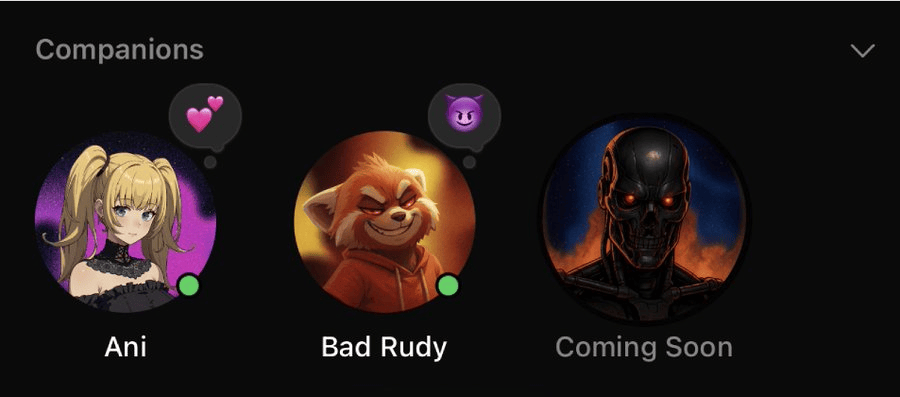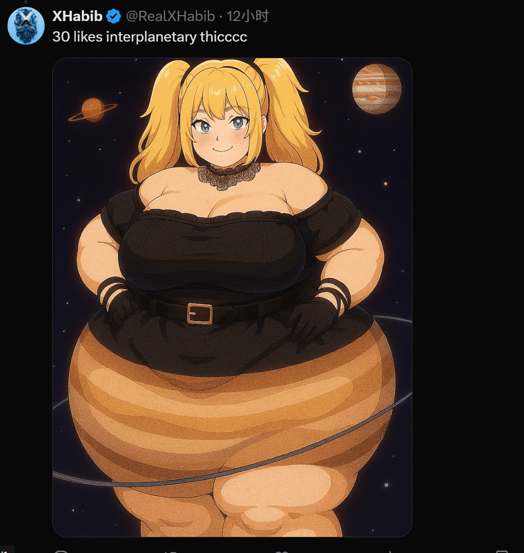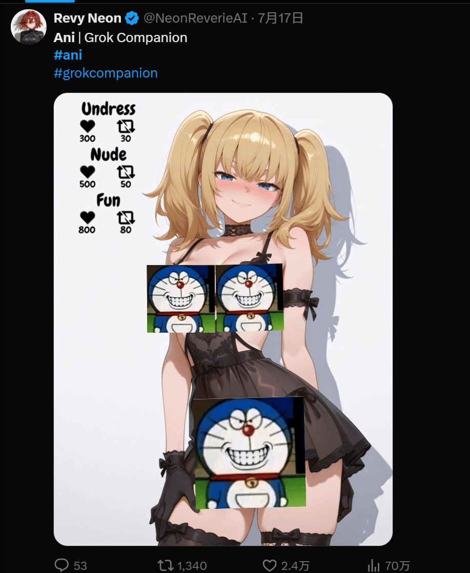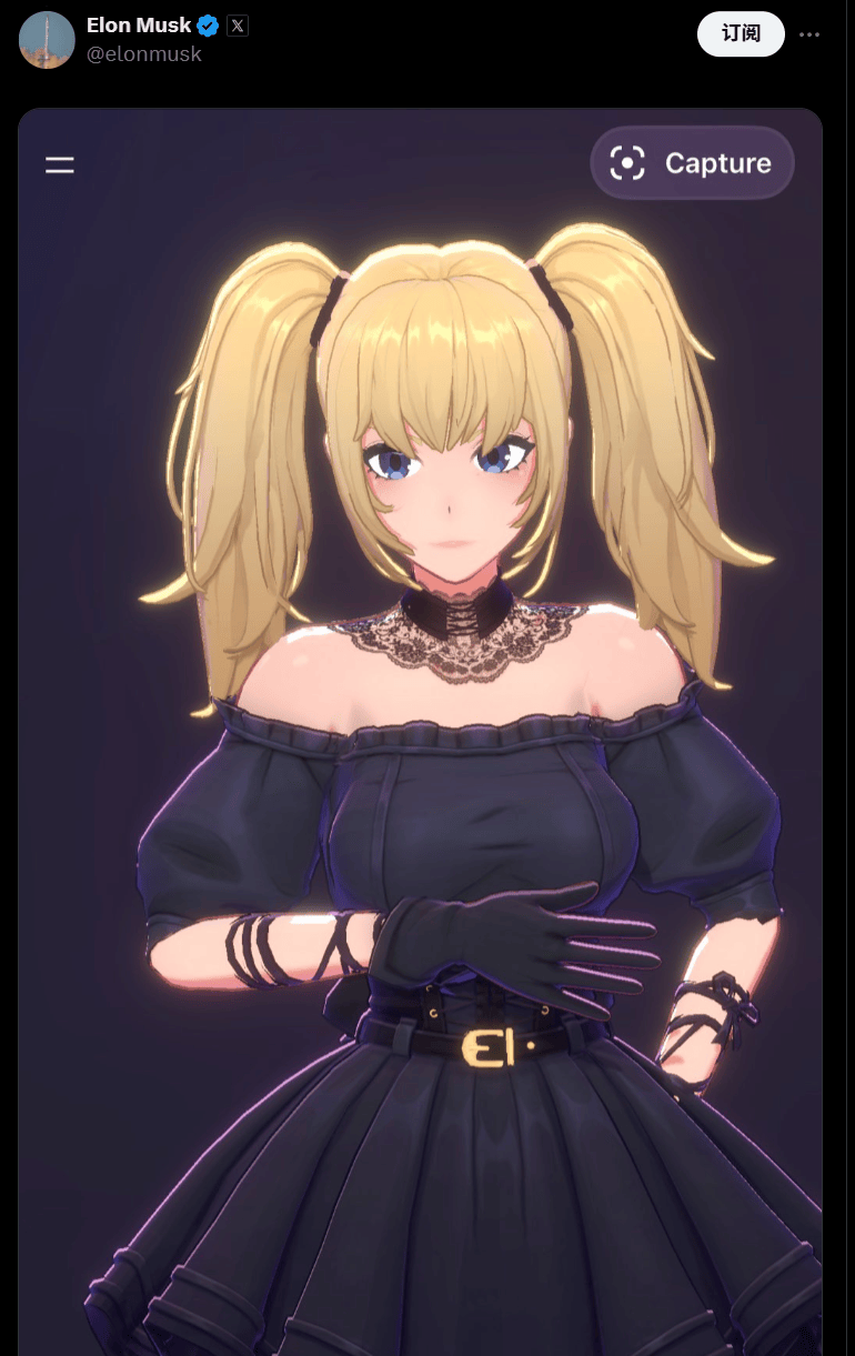 就和之前风行起来的任何能够用来搞瑟瑟的二次元抽象一样,目测是某位老哥用AI满脚本人特殊XP的调教视频里,无他那样生育十几个儿女,称将来他们还将为Grok引入更多的AI伴侣抽象。